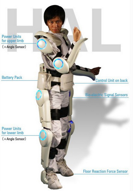HAL, which is an acronym for hybrid assistive limb, detects biosignals emitted from the brain to a muscle when a person tries to move. The exoskeleton, fitted with an array of sensors and power units, converts these biosignals into assisted movement.