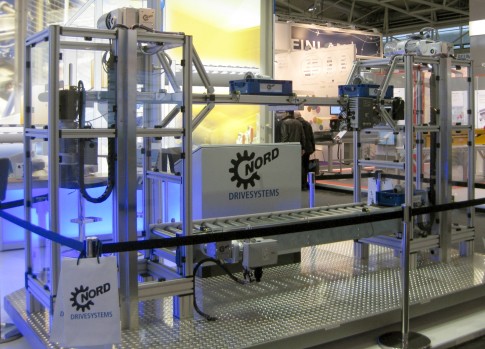 In order to seamlessly transfer baggage to the hoist, the various drive units were synchronized. In the exhibition demonstration, a compact SK 180E inverter controls the roller conveyor drive, also allowing for accumulation and synchronization. Featuring the same operating interface, NORD's SK 135 soft starter / reversing starters provide protection for the conveyor and gear unit mechanics.