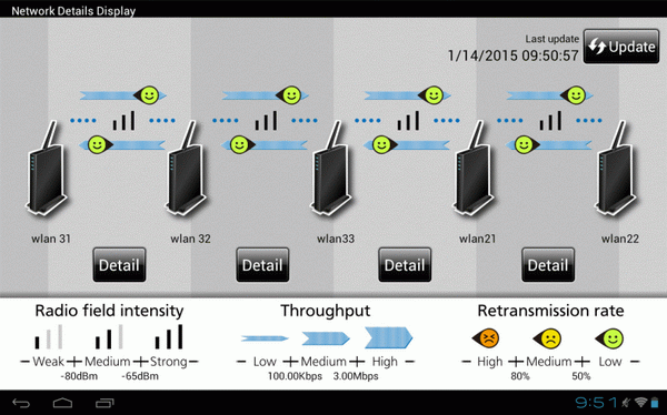 Mitsubishi Electric's visualization software is a simple user interface for monitoring the wireless channels. It instantly visualizes signal conditions and possible breakdown locations to enable users to find the best locations for installing cameras. Even non-technical persons can build and operate a network.