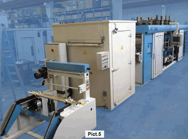 For this reason, special pre-heaters have been studied and the market offers different solutions. Since the mid-eighties, WM Wrapping Machinery SA has performed a number of tests developing various alternatives (see picture 1) such as infra-red radiation systems, contact by rollers etc. The best final solution that ensured the greatest benefit was the oven with hot air circulation (see pictures 2 and 3).