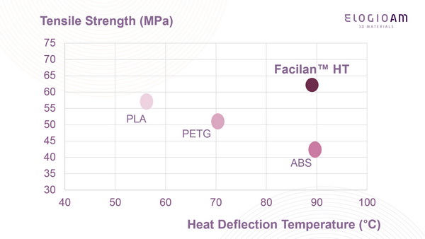 FDM Additive Manufacturing requires more durable and high strength materials to take full benefits of 3D printing. PLA, PET are of limited use for durable application due to their relatively low temperature resistance while ABS suffers of warping and relatively low strength. Facilan HT is designed to address those common product limitations and specifically designed for 3D printing. It is a safe copolyester with high temperature resistance with heat deflection temperature of 89C. Its high stiffness enables design optimization for faster rigid part print jobs.