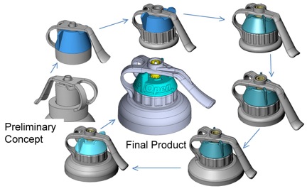 VPI engineers worked closely with the Gebauer staff to propose and refine initial design concepts to find ways to improve the look. Below are graphics and photos from the design process for the Ethyl Chloride can product lines. Photo Caption: Final Product Line Up With New Actuators Manufactured By Venture and Gebauer