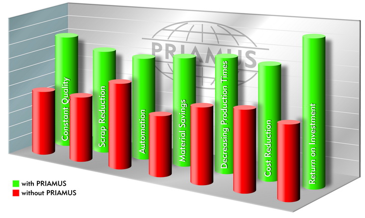 With the PRIAMUS cost-benefit-analysis the potential savings for a given part can be calculated by entering the required parameters. With the help of PRIAMUS systems, scrap will be minimized and rejects are reliably minimized and contained. The cost-benefit-analysis calculates the annual savings or return on investment attributable to more consistent part production as well as improved manufacturing efficiency.