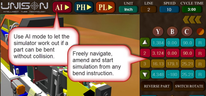 Unison's 3D simulator shortens the design-test-optimise process dramatically, eliminating the need for a bending machine and its operator until manufacturing commences. For example, designers can now typically verify whether a part can be bent within about 3 minutes. The simulator accepts the same YBC file that is normally used to control the bending machine and runs it offline, to create a motion profile that defines how each axis on the real machine will move. The designer can then simulate the part to check its design. The simulator's physics engine has access to a database containing configuration details of every machine in Unison's Breeze range of tube benders, together with comprehensive performance data for all motorised axes, enabling the computer-generated imagery to be controlled accurately and realistically