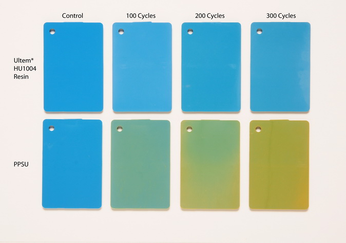 The findings demonstrate that Ultem HU1004 resin provides superior color stability vs. PPSU. In fact, PPSU showed a color shift up to 10 times greater than Ultem HU1004 resin, becoming significantly yellowed after only 100 STERRAD® NX® cycles. Ultem resin also delivered superior mechanical properties, including retention of mass and impact performance, compared to PPSU.