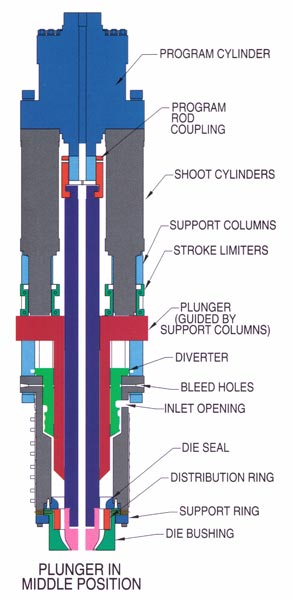 Wall thickness adjustments for parison curl are performed by four bolts that shift a flow ring in the bushing. The head tooling and program rod itself remain centered to the head.