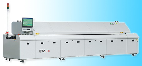 > Eight groups of top and bottom forced hot air convection heating zones.