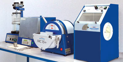 On the table on the left: Vacuum investment machine for bubble-free mixing of the investment compound and filling of the flask. The integrated vibrator eliminates any possible airlocks. The 1100ºC furnace for melting out the wax and burn-out the form. Mini casting machine, here the MC 15+. Sand blasting cabinet for easy removal of plaster. |