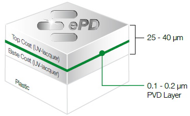 ePD™ is the short form for "embedded PVD for Design parts" and signifies an environment-friendly and future-oriented coating procedure. Whenever high-end metallic surfaces on plastic parts are requested - ePD™ is the clean alternative compared to today''s electro plating technologies. No harmful chemicals such as Cr6+ are used in the process. The ePD™ process is environmentally friendly due to low energy consumption and the avoidance of special waste. ePD™ coated parts are fully recyclable. PVD layer between Base and Top Coat (UV lacquer) The new process is described as "embedded PVD for Design parts", since the metallisation effect is sandwiched between two layers of UV lacquer. The first layer is the primer, or base coat, which serves to equalise irregularities on the surface of the injection-moulded plastic substrate. On top of this comes the actual inline PVD, which uses magnetron sputtering in a vacuum chamber for an exceptionally stable coating with high microstructure density-with no harmful ions left behind. To protect the metallized coating, a final UV coating (top coat) is applied which is extremely durable, stable and, fast-drying.