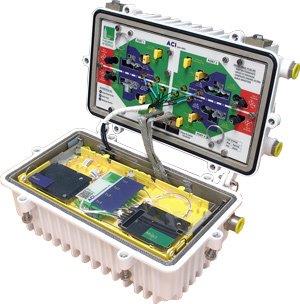 The Emerald is designed from the ground up for effective use of space and maintenance friendliness as a full-featured 4x4 node in a mini bridger housing. The RF module is arranged so plug- ins are easy to spot and handle. The fiber tray is full sized and swings away from the optics lid tackle box style to ease fiber and optics module work. Even the thumb sized optics sport regular sized test points, full sized pull rings, and easy to reach pad locations.