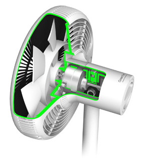 Green fan Barumyuda proprietary technology, the technology to change the direction and movement of wind speed by sending the wind from the fan of one of two types. Wings of the double layer structure, the wind a little, from the outside and sends out a lot of wind from the inside.