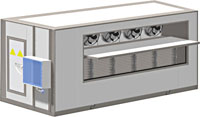 The Alfa Igloo insulated air cooler is a sturdy and flexible heavy-duty industrial air cooler, specially designed for high-capacity cooling and freezing applications in, for instance, large logistic centres. The heat exchanger is situated inside an insulated casing. This casing is fitted with an adjustable flap door. During freezing operation this flap door separates the air-on and air-off flows. The flap door will be closed during the defrosting process, thus enhancing defrost efficiency and preventing defrost heat from entering the cell. Special attention has been paid to various construction details in order to achieve trouble-free operation, easy installation and maintenance and a long life. The construction is standardized with regard to the external dimensions of the insulated casing, while flexibility in the heat exchanger design is maintained.
